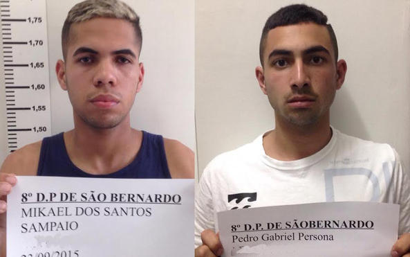 Na tarde de ontem (23), dois estabelecimentos comerciais nos bairros Jardim Ipanema e Jardim Laura em São Bernardo do Campo foram assaltados.O primeiro delito ocorreu por volta das 10h da manhã a uma adega no Jardim Laura, já o segundo a um mercado no Jardim Ipanema. Ambos foram realizados da mesma forma, um veículo Palio Weekend parava na porta do local, um indíduo descia, se passava por cliente e por fim anunciava o assalto com grave ameaças e um revólver.A equipe de investigação do 8º DP de São Bernardo, presidida pelo Dr. Baldomero Gerbal, iniciou então um processo de investigação e busca de suspeitos, foi quando em patrulhamento avistaram um veículo estacionado com as características do utilizado para práticas dos crimes. Chegaram então a Pedro Gabriel Persona, de 19 anos, que após ser revistado e indagado sobre a suspeita acabou por assumir o crime, indicou também o comparça, Mikael dos Santos, 19, que morava próximo ao local.A polícia foi em busca de Mikael, quando chegou a residência do mesmo, tentou fugir mas foi detido. Os dois roubaram barras de chocolate, achocolatado, bebidas alcóolicas e cerca de R$ 500,00 em dinheiro.As autoridades ainda trabalham na busca de outras possíveis vítimas dos dois, se você os reconheceu entre em contato com o 8º DP, que fica localizado na Estrada dos Alvarengas, 3517 – (11) 4342-8435.