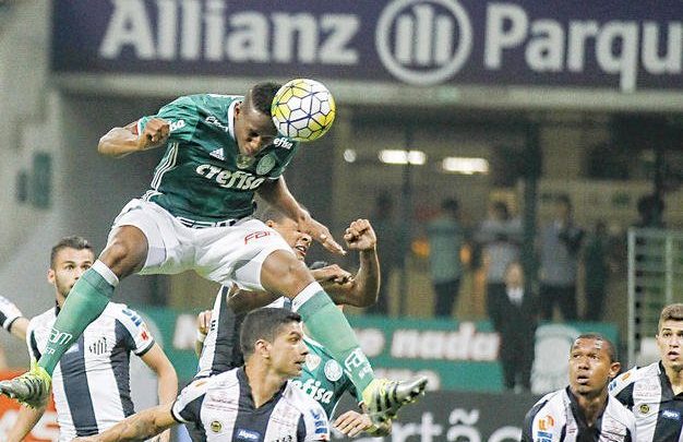 Depois de 14 rodadas, o Palmeiras tropeçou como mandante de campo no Campeonato Brasileiro. O Santos, diante de um clima hostil, não se intimidou e saiu do Allianz Parque com um importante ponto, após empate por 1 a 1.O placar foi aberto aos seis minutos do primeiro tempo. Dudu cobrou escanteio para o meio da área e o zagueiro Yerry Mina apareceu entre a defesa santista para desviar para o gol e marcar o primeiro da partida e o seu com a camisa do Palmeiras.Assim como todo clássico, o jogo continuou quente no primeiro tempo. O Santos com a desvantagem tentou furar a defesa adversária com contra-ataques, mas o intervalo chegou e nada mudou.Complementar Na etapa complementar o Palmeiras, diante da torcida tentou conduzir a partida para a vitória, mas um erro de percurso, fez com que o líder do Campeonato Brasileiro perdesse a chance de ampliar a vantagem numérica na tabela frente o seu arquirrival Corinthians, que segue logo na segunda colocação.Aos 10 minutos da etapa complementar, na cobrança de falta de Vitor Bueno, a bola bateu na barreira e sobrou para Rodrigão, que serviu Gabriel. O atacante limpou a marcação e arriscou de fora da área. Vitor Hugo colocou a canela na frente e o desvio matou Fernando Prass.Com o empate o Palmeiras segue líder com 29 pontos. Já o Santos na 4ª colocação soma 23.
