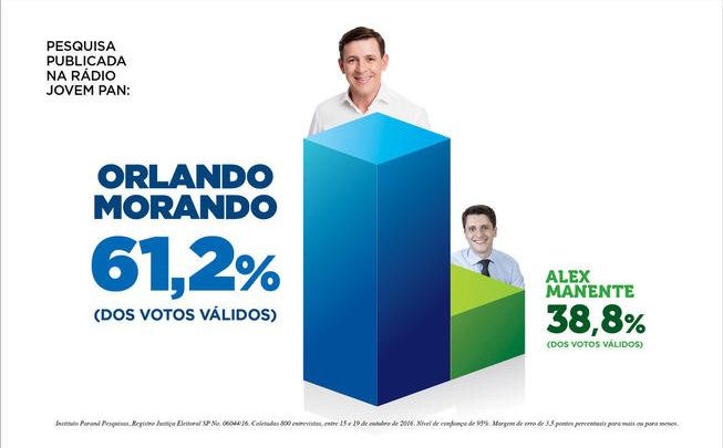 Alex Manente só lidera a pesquisa na rejeição. De acordo com o levantamento, 46,4% dos eleitores não votariam de jeito nenhum no popular-socialista, neste cenário Orlando Morando apresenta resultado um pouco melhor ao ser rejeitado por 34,3% dos entrevistados. O estudo ainda indica que 27,6% do eleitorado não votariam em nenhum dos dois enquanto 3,5% não souberam responder o questionamento.