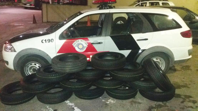 Na abordagem, os policiais localizaram 15 pneus dentro do veículo. Indagados sobre a origem dos produtos, a dupla confessou ter efetuado o furto em uma loja especializada perto dali.