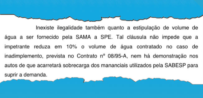Em trecho do despacho, a juíza ressalta: “Inexiste ilegalidade também quanto a estipulação de volume de água a ser fornecido pela Sama a SPE. Tal cláusula não impede que a impetrante (Sabesp) reduza em 10% o volume de água contratado no caso de inadimplemento, prevista no Contrato Nº 08/95-A, nem há demonstração nos autos de que acarretará sobrecarga dos mananciais utilizados pela Sabesp para suprir a demanda”.