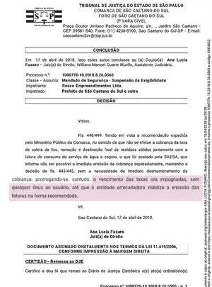 No despacho, a juíza entende como procedente a manifestação do Ministério Público, de que a taxa deve ser cobrada em separado da conta de água e esgoto. Na determinação, Ana Lucia Fusaro destaca que “ao não ser possível a imediata emissão da cobrança separadamente” deve-se então “prorrogar-se o vencimento das taxas ora impugnadas, sem qualquer ônus ao usuário, até que a entidade arrecadadora viabilize a emissão das faturas da forma recomendada”.