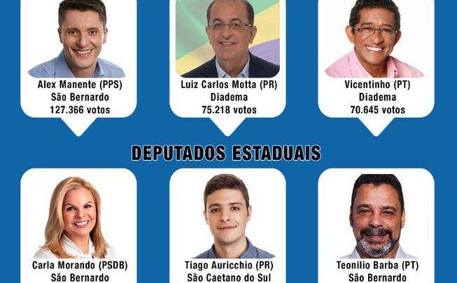Veja os deputados Federal e Estadual eleitos em São Paulo: 1. Eduardo Bolsonaro – PSL – 8,74% – 1.843.735 2. Joice Hasselmann – PSL – 5,11% – 1.078.666 3. Celso Russomanno – PRB – 2,47% – 521.728 4. Kim Kataguiri – DEM – 2,21% – 465.310 5. Tiririca – PR – 2,15% – 453.855 6. Tabata Amaral – PDT – 1,25% – 264.450 7. Policial Katia Sastre – PR – 1,25% – 264.013 8. Sâmia Bomfim – PSOL – 1,18% – 249.887 9. Capitão Augusto – PR – 1,15% – 242.327 10. Pastor Marco Feliciano – PODE – 1,14% – 239.784 11. Baleia Rossi – MDB – 1,01% – 214.042 12. Vinicius Poit – NOVO – 0,98% – 207.118 13. Luiza Erundina – PSOL – 0,84% – 176.883 14. Renata Abreu – PODE – 0,76% – 161.239 15. Rui Falcão – PT – 0,75% – 158.389 16. Alexandre Frota – PSL – 0,74% – 155.522 17. Ivan Valente – PSOL – 0,74% – 155.334 18. Marcos Pereira – PRB – 0,66% – 139.165 19. Carlos Zarattini – PT – 0,65% – 137.909 20. Marco Bertaiolli – PSD – 0,65% – 137.628 21. Marcio Alvino – PR – 0,64% – 135.844 22. Guilherme Mussi – PP – 0,64% – 134.301 23. Arnaldo Jardim – PPS – 0,63% – 132.363 24. Alex Manente – PPS – 0,60% – 127.366 25. Bruna Furlan – PSDB – 0,60% – 126.847 26. Carlos Sampaio – PSDB – 0,60% – 125.666 27. Nilto Tatto – PT – 0,59% – 124.281 28. Ricardo Izar – PP – 0,58% – 121.869 29. Vitor Lippi PSDB – 0,57% – 120.529 30. Tenente Derrite – PP – 0,56% – 119.034 31. Cezinha de Madureira – PSD – 0,56% – 119.024 32. Fausto Pinato – PP – 0,56% – 118.684 33. Luiz Philippe O. Bragança PSL – 0,56% – 118.457 34. Alexandre Leite DEM – 0,55% – 116.416 35. Paulo Freire Costa PR – 0,52% – 109.461 36. Enrico Misasi PV – 0,51% – 108.038 37. Rosana Valle PSB – 0,50% – 106.100 38. Samuel Moreira PSDB – 0,49% – 103.215 39. Vanderlei Macris PSDB – 0,49% – 102.708 40. Rodrigo Agostinho PSB – 0,47% – 100.179 41. Jefferson Campos PSB – 0,47% – 99.974 42. David Soares DEM – 0,47% – 99.865 43. Coronel Tadeu PSL – 0,47% – 98.373 44. Vinicius Carvalho PRB – 0,46% – 97.862 45. Eduardo Cury PSDB – 0,45% – 94.282 46. Miguel Lombardi PR – 0,44% – 93.093 47. Eli Corrêa Filho DEM – 0,44% – 92.257 48. Gilberto Nascimento PSC – 0,44% – 91.797 49. Geninho Zuliani DEM – 0,42% – 89.378 50. Alexandre Padilha PT – 0,42% – 87.576 51. Arlindo Chinaglia PT – 0,41% – 87.449 52. Professor Luiz Flavio Gomes PSB – 0,41% – 86.433 53. Roberto Alves PRB – 0,39% – 82.097 54. Junior Bozzella PSL – 0,37% – 78.712 55. Paulo Teixeira PT – 0,37% – 78.512 56. Milton Vieira PRB – 0,37% – 77.413 57. Carla Zambelli PSL – 0,36% – 76.306 58. Paulinho da Força SD – 0,36% – 75.613 59. Luiz Carlos Motta PR – 0,36% – 75.218 60. General Peternelli PSL – 0,35% – 74.190 61. Maria Rosas PRB – 0,34% – 71.745 62. Vicentinho PT – 0,33% – 70.645 63. Abou Anni PSL – 0,33% – 69.256 64. Alencar Santana – PT – 0,32% – 67.892 65. Orlando Silva PC do B – 0,31% – 64.822 66. Adriana Ventura NOVO – 0,30% – 64.341 67. Roberto de Lucena PODE – 0,27% – 56.033 68. Herculano Passos MDB – 0,24% – 49.653 69. Alexis NOVO – 0,21% – 45.298 70. Guiga Peixoto PSL – 0,15% – 31.718 Deputados estaduais: 1. Janaina Paschoal (PSL) – 2.060.786 Votos 2. Arthur Mamãe Falei (DEM) – 478.280 Votos 3. Carlos Giannazi (PSOL) – 218.705 Votos 4. Coronel Telhada (PP) – 214.445 Votos 5. Gil Diniz (PSL) – 214.037 Votos 6. Daniel José (Novo) – 183.480 Votos 7. Jorge Wilson Xerife Consumidor (PRB) – 177.414 Votos 8. Caio França (PSB) – 162.166 Votos 9. Delegado Olim (PP) – 161.569 Votos 10. Mônica da Bancada Ativista (PSOL) – 149.844 Votos 11. Edmir Chedid (DEM) – 131.531 Votos 12. Major Mecca (PSL) – 129.411 Votos 13. Heni Ozi Cukier (NOVO) – 130.214 Votos 14. André do Prado (PR) – 123.313 Votos 15. Alex de Madureira (PSD) – 118.294 Votos 16. Professor Kenny (PP) – 117.567 Votos 17. Marta Costa (PSD) – 117.156 Votos 18. Conte Lopes (PP) – 116.806 Votos 19. Campos Machado (PTB) – 115.580 Votos 20. Carlos Cezar (PSB) – 115.566 Votos 21. Cauê Macris (PSDB) – 114.690 Votos 22. Reinaldo Alguz (PV) – 114.352 Votos 23. Analice Fernandes (PSDB) – 110.089 Votos 24. Bruno Ganem (PODE) – 106.203 Votos 25. Milton Leite Filho (DEM) – 105.492 Votos 26. Delegado Bruno Lima (PSL) – 103.823 Votos 27. Fernando Cury (PPS)- 99.815 Votos 28. Daniel Soares (DEM)- 97.330 Votos 29. Barba (PT) – 91.394 Votos 30. Carla Morando (PSDB) – 89.636 Votos 31. Rogério Nogueira (DEM)- 89.040 Votos 32. Barros Munhoz (PSB) – 87.494 Votos 33. Professora Bebel (PT) – 87.169 Votos 34. Rodrigo Gambale (PSL) – 86.981 Votos 35. Enio Tatto (PT)- 86.744 Votos 36. Altair Moraes (PRB) – 86.230 Votos 37. Luiz Fernando (PT) – 85.271 Votos 38. Cezar (PSDB) – 84.657 Votos 39. Edna Macedo (PRB) – 84.144 Votos 40. Caruso (MDB) – 83.758 Votos 41. Gilmaci Santos (PRB)- 82.678 Votos 42. Itamar Borges (MDB) – 82.185 Votos 43. Marcos Damasio (PR) – 81.695 Votos 44. Rafa Zimbaldi (PSB) – 80.789 Votos 45. Paulo Fiorilo (PT) – 80.430 Votos 46. Wellington Moura (PRB)- 80.271 Votos 47. Dalben (PR) – 79.564 Votos 48. Jose Americo (PT) – 78.326 Votos 49. Ricardo Madalena (PR) – 77.554 Votos 50. Léo Oliveira (MDB) – 76.703 Votos 51. Rodrigo Moraes (DEM) – 75.845 Votos 52. Sebastião Santos (PRB) – 75.280 Votos 53. Douglas Garcia (PSL) – 74.351 54. Maurici (PT) – 74.254 Votos 55. Carlão Pignatari (PSDB) – 74.006 Votos 56. Thiago Auricchio (PR) – 73.435 Votos 57. Rafael Silva (PSB) – 71.992 Votos 58. Maria Lúcia Amary (PSDB) – 70.743 Votos 59. Roque Barbiere – Roquinho (PTB) – 70.076 Votos 60. Roberto Engler (PSB) – 69.969 Votos 61. Marcos Zerbini (PSDB) – 69.296 Votos 62. Emidio de Souza (PT) – 65.898 Votos 63. Mauro Bragato (PSDB) – 65.475 