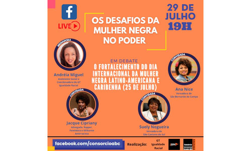 O Consórcio Intermunicipal Grande ABC transmite ao vivo, nesta quinta-feira (29/7), a partir das 19h, uma live com o tema “Desafios da mulher negra no poder”. Sendo assim o encontro tem como objetivo fortalecer o Dia Internacional da Mulher Negra Latino-Americana e Caribenha, celebrado em 25 de julho.