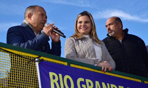 A cidade de Rio Grande da Serra registrou mais um grande investimento histórico junto ao Governo do Estado. O prefeito Claudinho da Geladeira e a deputada estadual Carla Morando trouxeram um aporte de R$ 2,5 milhões em equipamentos. Para celebrar esse momento, foi realizada a solenidade de entrega dos equipamentos aos secretários municipais, na manhã desta segunda-feira (13/06), na Praça Lídia Poloni, no Centro. O evento contou com a presença do prefeito Claudinho da Geladeira, da deputada Carla Morando, dos vereadores Elias Policial, Marcelo Akira, Zé Carlos e Roberto Contator, além dos secretários municipais e da população.