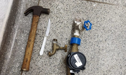 Após a abordagem de praxe e ao realizarem a busca pessoal foram encontrados a torneira e o hidrômetro furtados dentro de um saco de lixo, além de uma faca e um martelo utilizados na prática criminosa.
