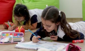 Deitadas no chão, desenhando no caderno, era como se as crianças estivessem à vontade na sala de casa. E o objetivo de levar a tarefa para essa sala mobiliada apenas com almofadas foi esse mesmo. “Por ser uma turma de período integral, faz falta um ambiente assim, que lembre a casa da gente. Aqui podemos ocupar diversos espaços, como fazer um passeio pelo jardim e tomar sol. São momentos muito gostosos”, comemora a professora.