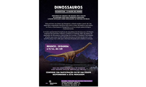 A mostra apresentará dezenas de esqueletos de dinossauros e fósseis originais dos períodos Triássico, Jurássico e Cretáceo, além da réplica do esqueleto em tamanho natural do dinossauro mais antigo do mundo, o “brasileiro” Buriolestes schultzi, que viveu há 233 milhões de anos, e contará ainda com uma enorme praça com café, loja e diversas ativações para adultos e crianças.