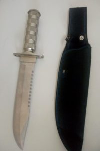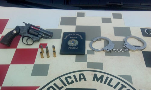 Após autorização do agressor, os policiais entraram na residência, onde foi encontrado um revólver calibre 22 (com três cartuchos deflagrados e três intactos), escondido em uma casinha de cachorro, uma faca e um porta-distintivo de polícia.
