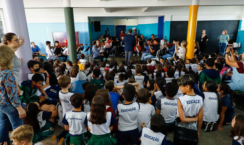 “Convidamos todos os alunos, do 1º ao 5º anos, para a apresentação. Algumas crianças nunca tinham visto de perto uma orquestra”, disse a diretora Carla Maria Teixeira Neves. E ficaram animadíssimas com a apresentação, preparada especialmente para elas, com músicas de super-heróis e filmes da Disney. Identificaram as melodias aos primeiros acordes.