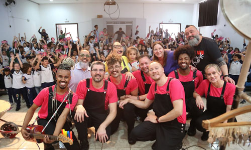 A vibração do ritmo conduzido pela Prof. DóRéMi (Rosa Alice) acompanha a energia contagiante do auditório lotado com cerca de 200 crianças do 1º ao 5º ano da EMEF Dom Benedito Paulo Alves de Souza, em São Caetano, a primeira de sete escolas de ensino fundamental atendidas pelo projeto Orquestra de Sucata – Música e Reciclagem no ABC Paulista.