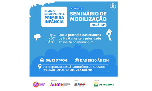 No dia 6 de dezembro, o projeto Primeira Infância Cidadã vai realizar em Mauá o Seminário de Mobilização do Plano Municipal pela Primeira Infância (PMPI), que acontecerá na Prefeitura Municipal de Mauá, das 8h30 às 12h. O encontro marca uma das etapas mais importantes para a priorização da primeira infância no município, pois dará início ao processo de elaboração ou revisão do PMPI, que visa adequar e organizar os investimentos em políticas que assegurem os direitos das crianças de 0 a 6 anos, com articulação de diferentes setores da administração municipal.