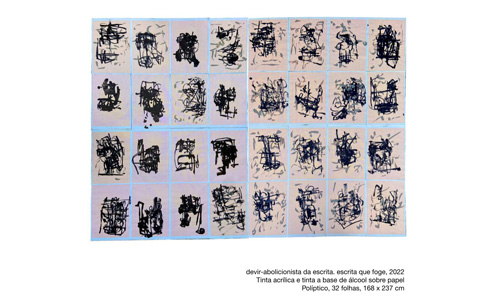 Assim, os pensamentos de Gilles Deleuze e Félix Guattari se conectam aos traços-texto que compõem as criações de Cab. O resultado são trabalhos diversos entre pinturas, desenhos e objetos escultóricos, em diferentes plataformas: telas, papéis, aço, textos e performances que serão observadas exclusivamente pela luz natural do espaço.