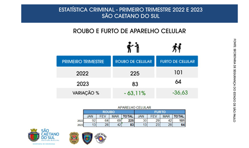 Os roubos de celulares registram forte queda de 63,2% em São Caetano, passando de 225 ocorrências no primeiro trimestre de 2022 para 83 no mesmo período deste ano. Levantamento da SSP – Secretaria de Segurança Pública do Estado de São Paulo, divulgado no fim de abril, já havia apontado que os roubos de veículos despencaram 60,3% no mesmo período de comparação (de 68 para 27). Veja o quadro ao lado.
