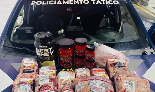Uma equipe da ROMU (Rondas Municipais) recebeu aviso da Cecom (Central de Comunicação) para verificar ocorrência de furto no supermercado. Durante a busca pessoal, os agentes encontraram carnes e suprimentos alimentares na mochila e na motocicleta do homem, além de um desacoplador utilizado para retirar alarmes das mercadorias.