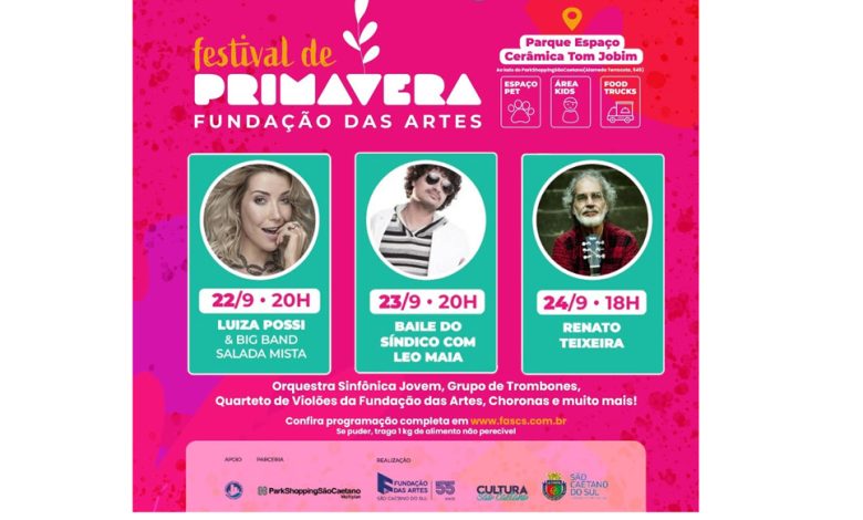 Nos dias 22, 23 e 24 de setembro, o Parque Espaço Cerâmica Tom Jobim, que fica ao lado do ParkShopping São Caetano, receberá o Festival de Primavera Fundação das Artes. Parceria da Fundação das Artes, ParkShopping São Caetano, Secretaria Municipal de Cultura e Prefeitura Municipal de São Caetano do Sul, o evento ao ar livre contará com shows gratuitos, gastronomia e diversão para toda a família.