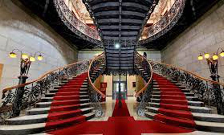 A escadaria principal é de design belga e foi produzida na Alemanha. A obra de arte apresenta uma tecnologia avançada para a época chamada de técnica Joly. Isso significa que a escada é composta por diversas peças separadas, que foram montadas em conjunto até formar a estrutura da escadaria, que, por sua vez, faz parte da sustentação do piso de cima do Palácio.