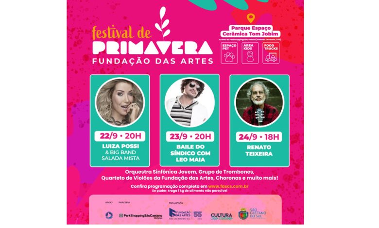 Nos dias 22, 23 e 24 de setembro, o Parque Espaço Cerâmica Tom Jobim, ao lado do ParkShopping São Caetano, receberá o Festival de Primavera Fundação das Artes. Parceria da Fundação das Artes, ParkShopping São Caetano, Secretaria Municipal de Cultura e Prefeitura Municipal de São Caetano do Sul, o evento ao ar livre contará com shows gratuitos, gastronomia e diversão para toda a família, além de ações formativas, como oficinas, workshops e cursos, voltados aos estudantes de música, professores, músicos e demais interessados, realizados nos dias que antecedem o festival.