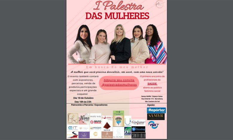 No mês de outubro, um evento inédito promete levar o bem-estar, saúde da mulher, a prevenção de diversas doenças e a comunicação, para mais de 250 mulheres em São Caetano e região. A “I Palestra das Mulheres” com o tema “A mulher que você precisa descobrir, em você, com uma nova versão” será realizada no dia 19 de outubro, das 18h às 23h, no Samyr Buffet, localizado na Rua Oriente, 173.