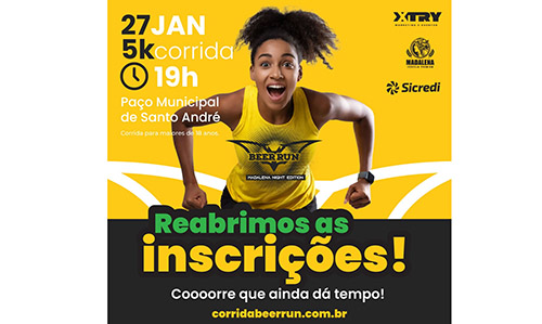 a retirada do kit no mesmo dia da prova (27/01/2024), percurso noturno e NA CHEGADA, no local , muita Cerveja Madalena em uma Arena com espaço gastronômico variado e palco com bandas de rock!TODOS INSCRITOS TERÃO SUA VAGA GARANTIDA PARA ESSA NOVA DATA! Patrocinador: Sicredi, cerveja oficial da prova é a Cerveja Madalena, organização da Xtry Marketing Esportivo e apoio da Prefeitura de Santo de André.