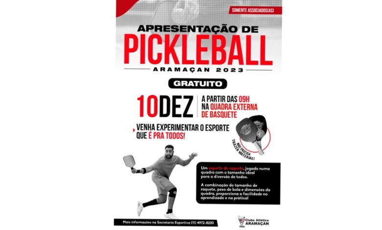 O Aramaçan vai trazer aos associados o esporte que é a nova mania nos Estados Unidos . O Pickleball é um esporte de raquete ou remo em que dois (simples) ou quatro (duplas) jogadores acertam uma bola de plástico perfurada e oca. Joga-se com raquetes sobre uma rede de 34 polegadas (0,86 m) até que um dos lados não consiga devolver a bola ou cometa uma infração.