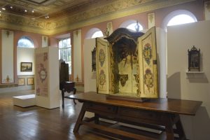 Nesta exposição, a equipe curatorial formada por Vinícius Duarte, Saulo Marques e Deise Silveira, funcionários e pesquisadores do acervo do museu, optou por não inserir santos nos nichos dos oratórios de salão. A proposta é possibilitar a apreciação do oratório per se, incitando os visitantes a observarem detalhes da confecção destes objetos, tanto da fatura da madeira quanto da policromia que apresentam em seu interior ou externamente.