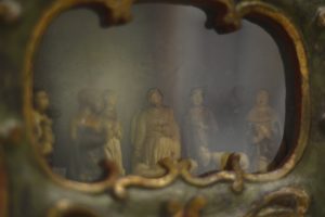 Oratórios centenários com diferentes formatos e finalidades –Os oratórios podem assumir diversos formatos em função da finalidade para os quais foram produzidos. Os oratórios de tipo maquineta se apresentam sob a forma de caixas retangulares lisas ou chanfradas, produzidos em madeira e vidro, e decorados externamente com elementos curvilíneos e rocalhas. O interior desses oratórios é geralmente policromado e pode apresentar subdivisões em níveis: na base, apresentam uma cena da natividade ou presépio e, na parte superior, a representação do calvário. Em alguns casos, trazem ainda imagens dos santos de devoção pessoal de seus antigos proprietários.