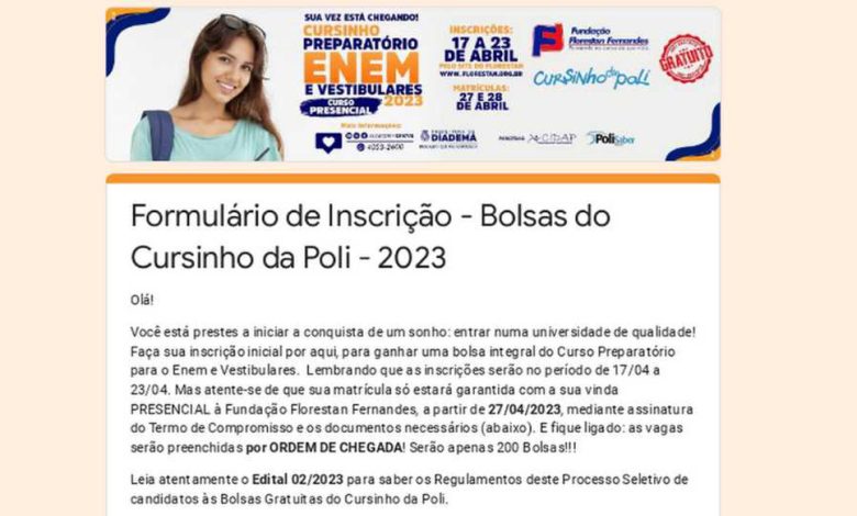 A Fundação Florestan Fernandes, autarquia vinculada à Prefeitura de Diadema e referência em ensino profissionalizante na cidade, em parceria com o Cursinho da Poli, realizará uma chamada pública para o preenchimento das vagas disponíveis no Curso Preparatório para o Exame Nacional do Ensino Médio (Enem) e outros vestibulares de 2024. O curso tem duração de um ano e ofertará bolsa integral.