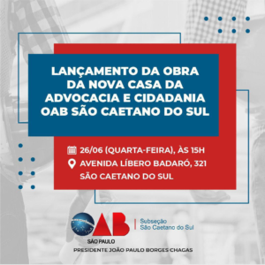 A OAB/SCS – 40ª Subseção da Ordem dos Advogados do Brasil em São Caetano do Sul, está prestes a realizar um marco histórico com o lançamento da obra de sua nova Casa da Advocacia e Cidadania. O evento está agendado para quarta-feira (26), às 15h, na avenida Líbero Badaró, 321, local onde será erguida a nova sede.