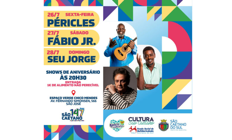 A Prefeitura de São Caetano do Sul preparou uma programação especial para comemorar os 147 anos da cidade, que serão completados no dia 28 de julho. Destaque para os shows dos cantores Péricles (26/7), Fábio Jr (27/7) e Seu Jorge (28/7), além de exposições e tradições locais que prometem envolver toda a comunidade.