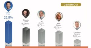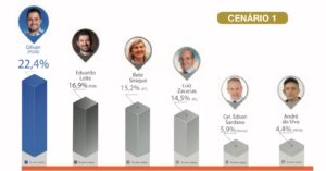 Nesse cenário, caso as eleições fossem realizadas hoje, Gilvan lideraria com 22,4%, seguido por Eduardo Leite PSB, com 16,9%. Bete Siraque –  PT, (15,2%) e o vice-prefeito Luiz Zacarias – PL, (14,5%) vêm logo em seguida. Além disso, o vereador Coronel Edson Sardano – NOVO, tem 5,9%, e André do Viva – PRTB, aparece com 4,4%.