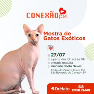 “Essa é a segunda Mostra de Gatos Exóticos promovida pelo Dr. Hato e a Royal Canin. A primeira edição, realizada em Santo André, foi um grande sucesso, encantando tutores de diversos lugares de São Paulo que vieram conhecer de perto essas raças exuberantes. Devido ao sucesso anterior, estamos trazendo o evento novamente, agora em nossa unidade de São Bernardo do Campo. A expectativa é mostrar a diversidade de raças, cada uma com seu charme e particularidades. É realmente impossível não se encantar e se apaixonar por esses gigantes de patas suaves”, destaca Taís Alvares, gerente de marketing do Dr. Hato.