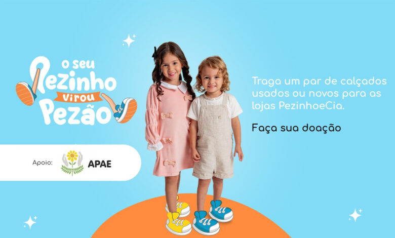 A doação de sapatos infantis é uma ação de solidariedade que tem um impacto profundo na vida de crianças carentes. Pensando nisso, a Pezinho e Cia., rede especializada em calçados infantis multimarcas do Brasil, está na segunda edição do projeto “O Seu Pezinho Virou Pezão”. A primeira parceria aconteceu no ano passado, com a CUFA (Central Única das Favelas), e arrecadou mais de 1.800 pares de sapatos. Este ano, a colaboração firmada é com as APAEs (Associação de Pais e Amigos dos Excepcionais) e pretende superar a marca anterior, buscando arrecadar cerca de 2.500 pares de sapatos até o final de agosto.