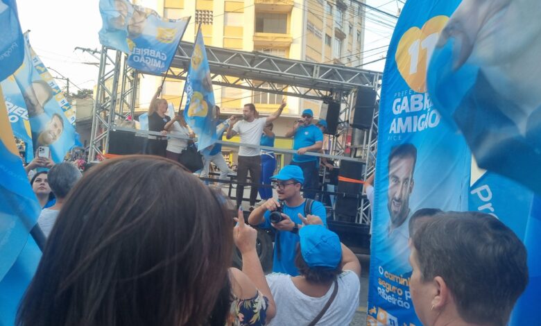 A caminhada seguiu para a rua do comércio onde, no calçadão, Gabriel subiu no carro de som e falou sobre suas propostas, lembrando que irá acabar com a taxa do lixo, restabelecer o transporte e fortalecer a segurança pública na cidade.