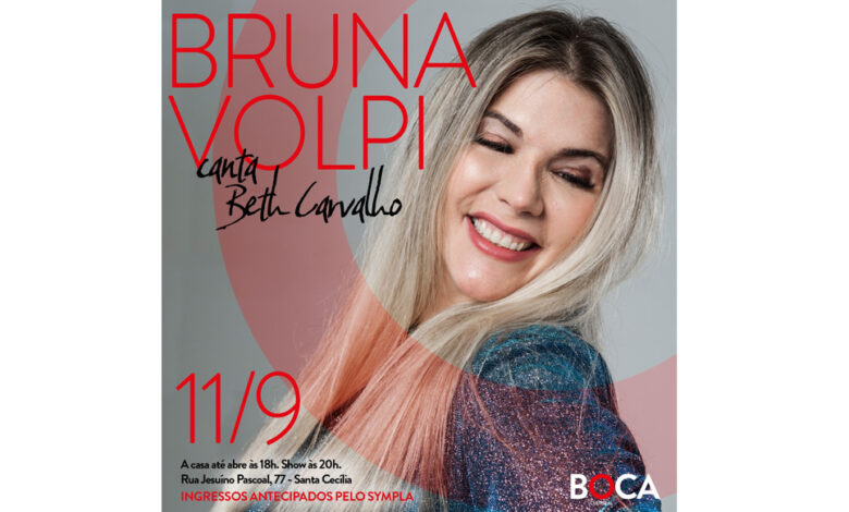 Bruna Volpi, considerada a sucessora de Beth Carvalho e Clara Nunes pelo produtor musical Rildo Hora (que trabalhou com a própria Beth) e por Danilo Caymmi (compositor de um dos maiores sucessos na voz da madrinha do samba, “Andança”), estreia um show em São Paulo. Resgatando canções que marcaram a trajetória da eterna rainha do samba, Bruna promete uma verdadeira celebração à história do gênero.