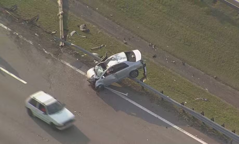 Acidente no Rodoanel deixa carro pendurado e destrói guard rail em São Bernardo