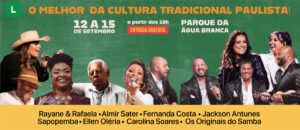 O Revelando SP, maior festival da valorização da cultura tradicional paulista, retorna à capital paulista entre os dias 12 e 15 de setembro. O cantor Almir Sater e Os Originais do Samba estão confirmados para o evento. Iniciativa do Governo do Estado de São Paulo, por meio da Secretaria da Cultura, Economia e Indústria Criativas, com com realização da Prefeitura de São Paulo e produção da Associação Paulista dos Amigos da Arte, o Revelando SP acontece no Parque da Água Branca, na Zona Oeste, com entrada gratuita.