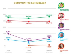 Além disso, outros nomes também foram mencionados: o Sargento Simões – PL, com 6,29%, Lourencini – PSDB, com 5,14%, e Amanda Bispo – UP, com 1,86%. Todavia, brancos e nulos somam 6,29% e 14,29% dos eleitores afirmam não saber ou não opinaram sobre em quem votar.