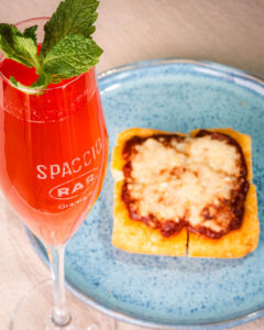 Campari Spring e Sfincione alla Palermitana – uma combinação perfeita de sabores para dar início à refeição com o toque autêntico da Sicília.