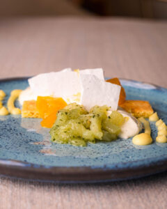 Para fechar com chave de ouro, um irresistível doce de abacaxi com manjericão, maracujá, creme de baunilha, cream cheese e crocante biscoito mil folhas, trazendo perfumes e sabores marcantes da estação.