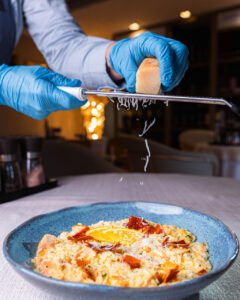 Uma harmoniosa fusão de risoto de salmão com um toque cítrico de laranja e a sutileza do Prosciutto RAR, criando um prato que combina o frescor da primavera com o requinte dos ingredientes RAR.