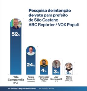 A população de São Caetano do Sul deverá eleger amanhã (6/10) o vereador Tite Campanella (PL) como o próximo prefeito da cidade. Pesquisa Vox Populi aponta a vitória do liberal com larga vantagem sobre Fabio Palacio (Podemos). Tite tem 52% das intenções de voto, contra 24% de Palacio. A pesquisa foi contratada pelo jornal ABC Repórter e realizada entre os dias 2 e 3 de outubro – foram ouvidos 600 eleitores.