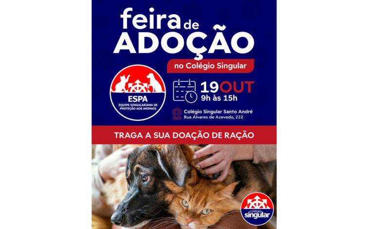 No próximo sábado (19 de outubro), das 9h às 15h, a unidade do Colégio Singular (rua Álvares de Azevedo, 222 – Centro – Santo André), por meio da ESPA – Equipe Singulariana de Proteção aos Animais, sediará uma feira de adoção animal. A entrada é gratuita e aberta à comunidade.