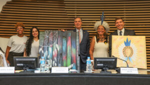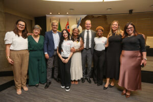 O encontro, que tratou de ações afirmativas e o enfrentamento da desigualdade, começou com uma apresentação das representantes do 3º ano do Ensino Médio da Escola Sesi de São Bernardo do Campo, Maria Eduarda Pereira dos Santos e Natália Calicchio Moreno.