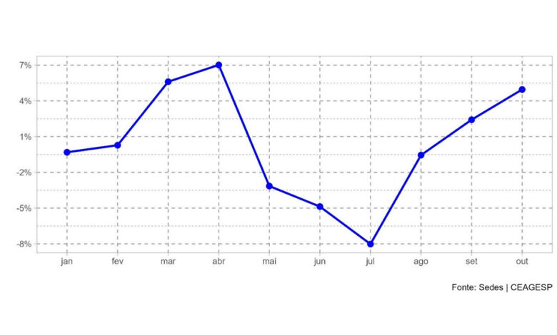 – O índice de preços CEAGESP encerrou o mês de outubro com variação de 4,96% ante uma variação de 2,42% no mês anterior. No mesmo período do ano passado, o índice apresentou variação de 6,74%. Com o resultado obtido, o índice encerrou o período apresentando um acumulado de 2,37% no ano e 9,29% em 12 meses.