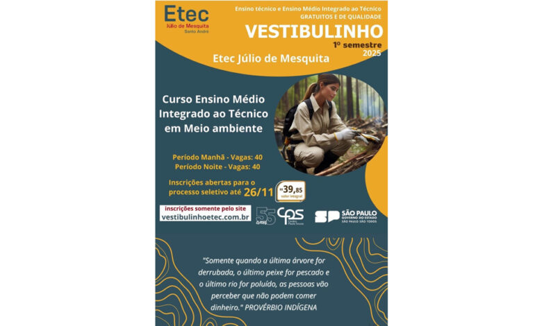Esta é a primeira vez que a Etec Júlio de Mesquita irá ofertar o curso técnico em Meio Ambiente integrado ao Ensino Médio na modalidade noturno, atendendo à demanda de alunos que buscam cursar o ensino médio, junto com o ensino técnico, enquanto trabalham ou estagiam.