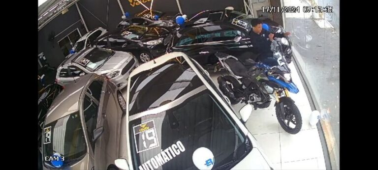 Uma concessionária localizada na rua Jurubatuba, em São Bernardo, foi alvo de um furto audacioso, na madrugada do último domingo (17). Câmeras de segurança flagraram dois suspeitos quebrando a vitrine do estabelecimento e fugindo com uma motocicleta de luxo, modelo BMW/G310 GS, ano 2020, avaliada em R$ 40 mil.