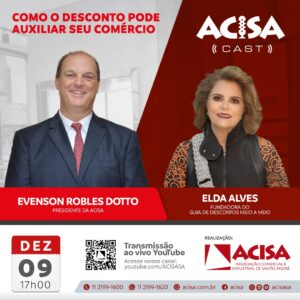 Para abordar o tema Como o desconto pode auxiliar o seu comércio, a ACISA – Associação Comercial e Industrial de Santo André – realizará um podcast na próxima segunda-feira (9 de dezembro), às 17h, pelo canal do YouTube ACISASA.