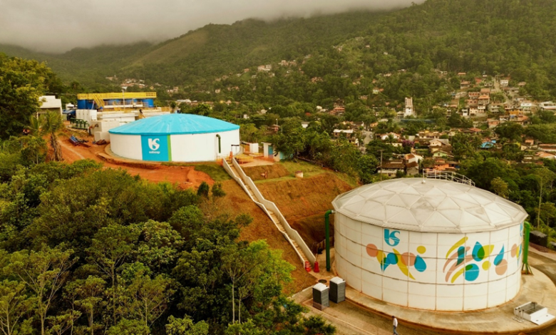 Novo reservatório (à dir.) e ETA Água Branca modernizada, em Ilhabela | Divulgação