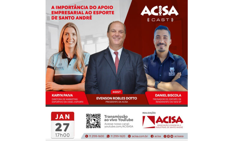 Para discutir essas questões e muitas outras sobre a importância de se investir no esporte, a primeira edição de 2025 do ACISA Cast, realizado pela Associação Comercial e Industrial de Santo André, receberá Daniel Biscola, treinador de Esporte de Rendimento do SESI-SP, e Karyn Paiva, diretora de Marketing Esportivo da Ossel Esporte.